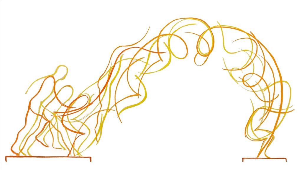 At first glance, this piece is more abstract. Instead of a clearly defined figure, the sculpture is made from a series of looping lines in steel, that trace the movement of the figure doing a forward flip in the air. The form suggests momentum, effort, suspension—perhaps even a moment of flight. There’s no single body to focus on, but movement itself becomes the subject.