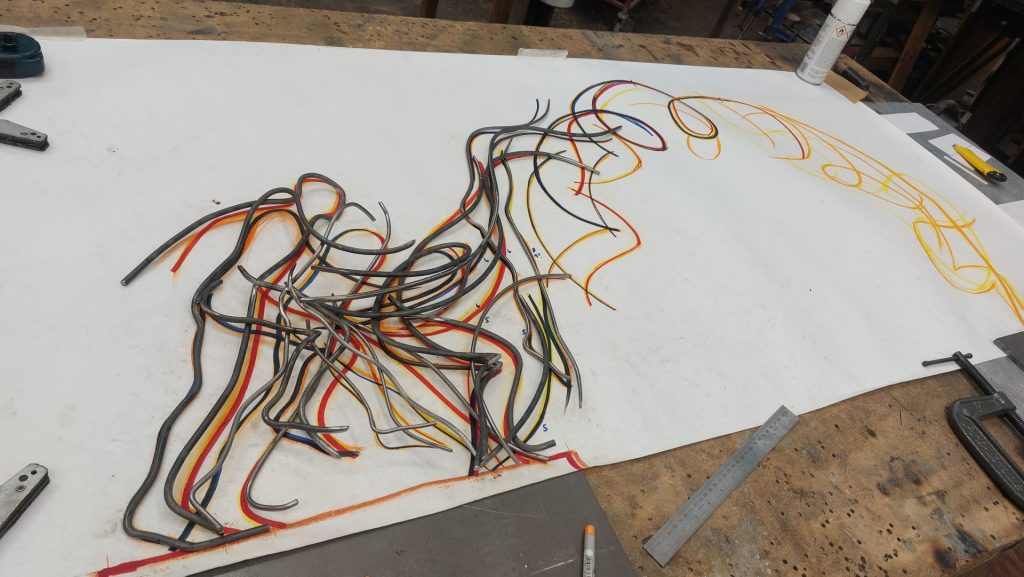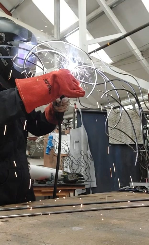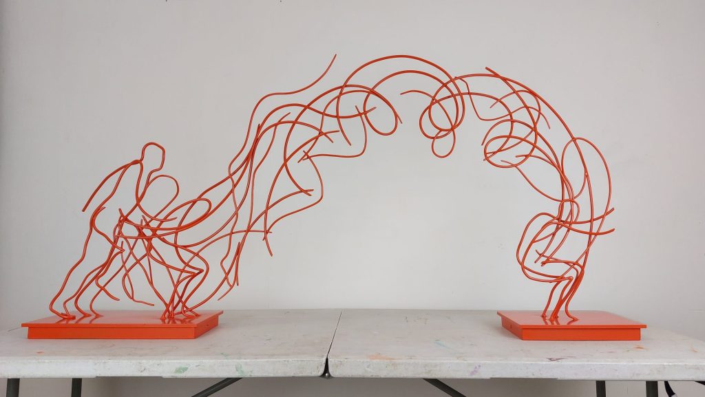 This way of working has grown naturally out of my studio practice. Alongside my bronze figurative sculptures, I’ve spent years making movement drawings, particularly of acrobats, tracing not just what a body looks like but the paths it travels through space. Those drawings gradually moved into three dimensions—first with wire and Perspex, and now steel. Steel has opened up new possibilities. It allows the lines to hold themselves confidently in space while still retaining a sense of lightness and freedom. There’s a satisfying tension in making something that feels fluid and almost effortless, yet is carefully engineered and balanced. The steel work has been hugely challenging, as my design was driven my creativity and not practicality! But with the help of Alastair Burgess, I have learnt how to weld and work with mild steel to create this sculpture, but there is much room for improvement and refinement to create larger version of this sculpture.
